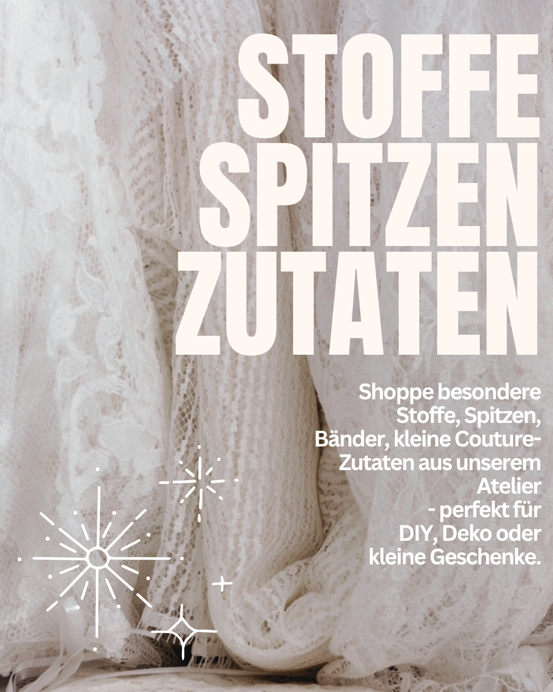 Freu dich auf Stoffe, Spitzen, Bänder, Perlen und Couture-Zutaten aus unserem Atelier.
