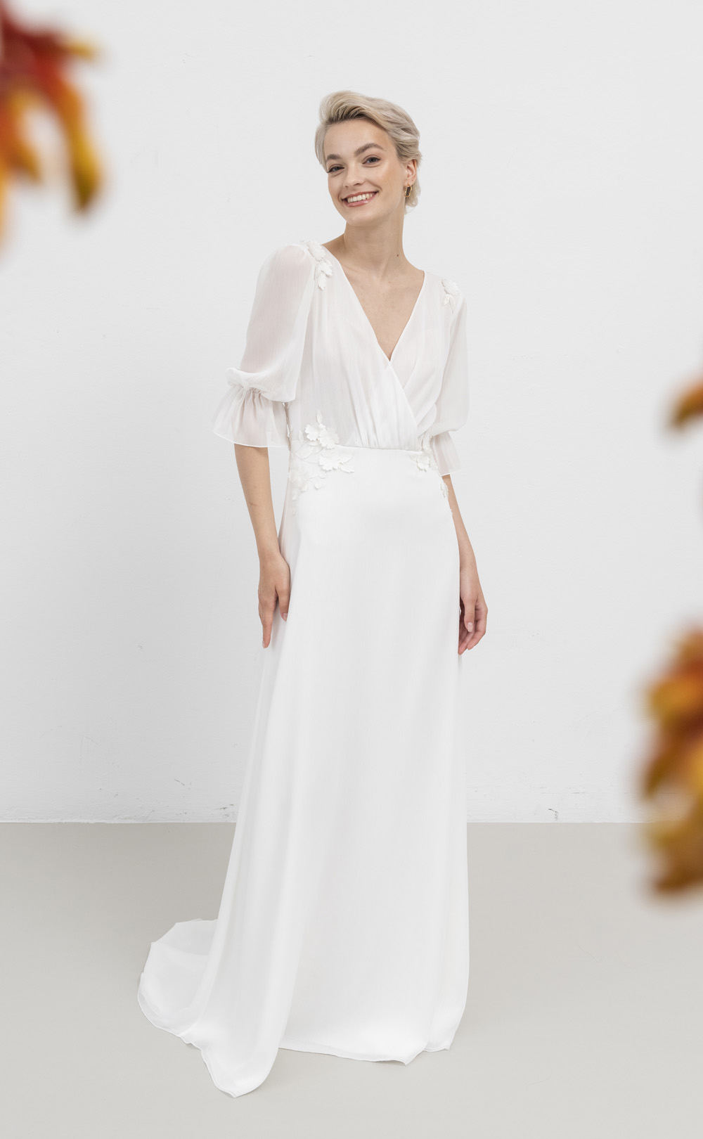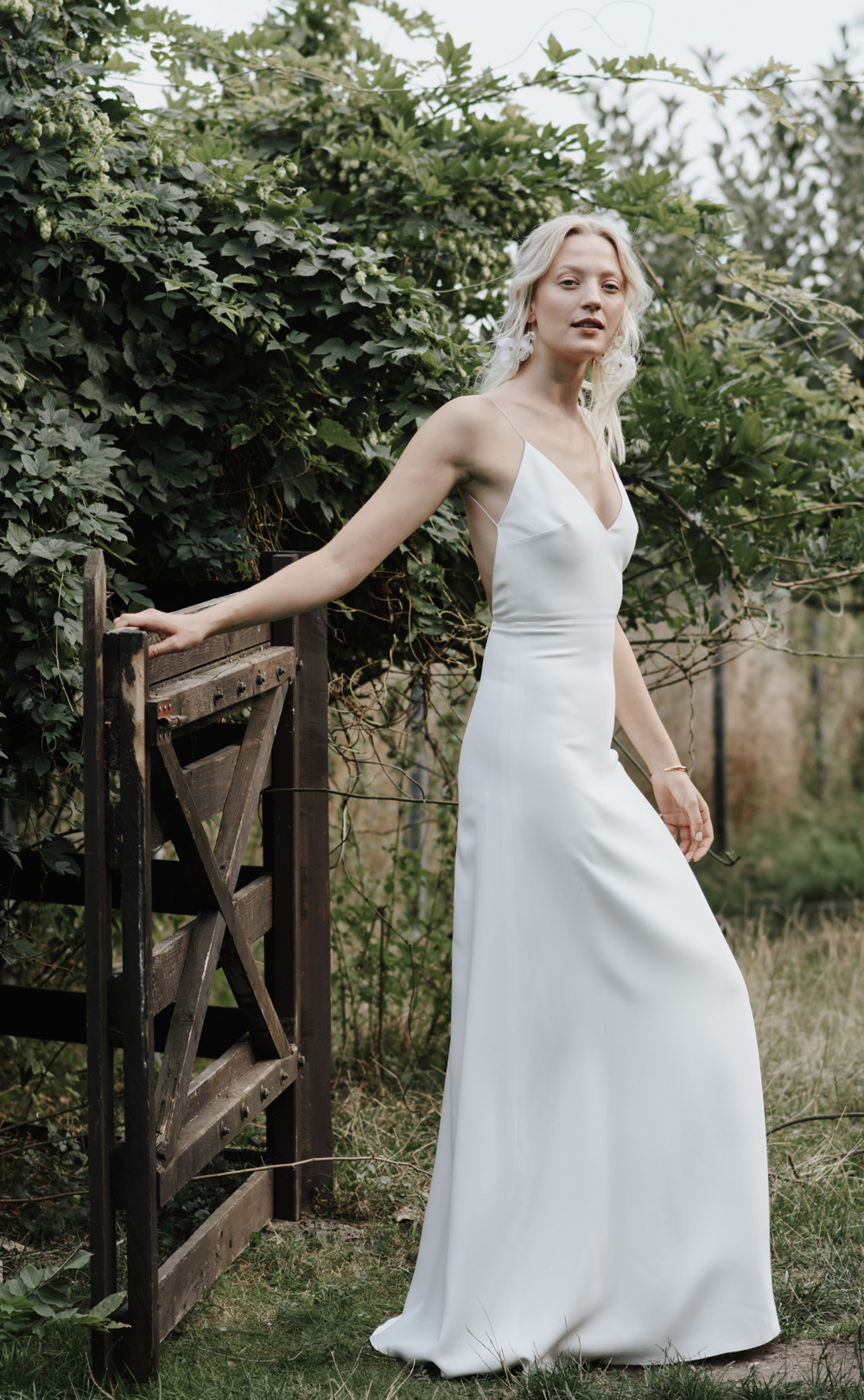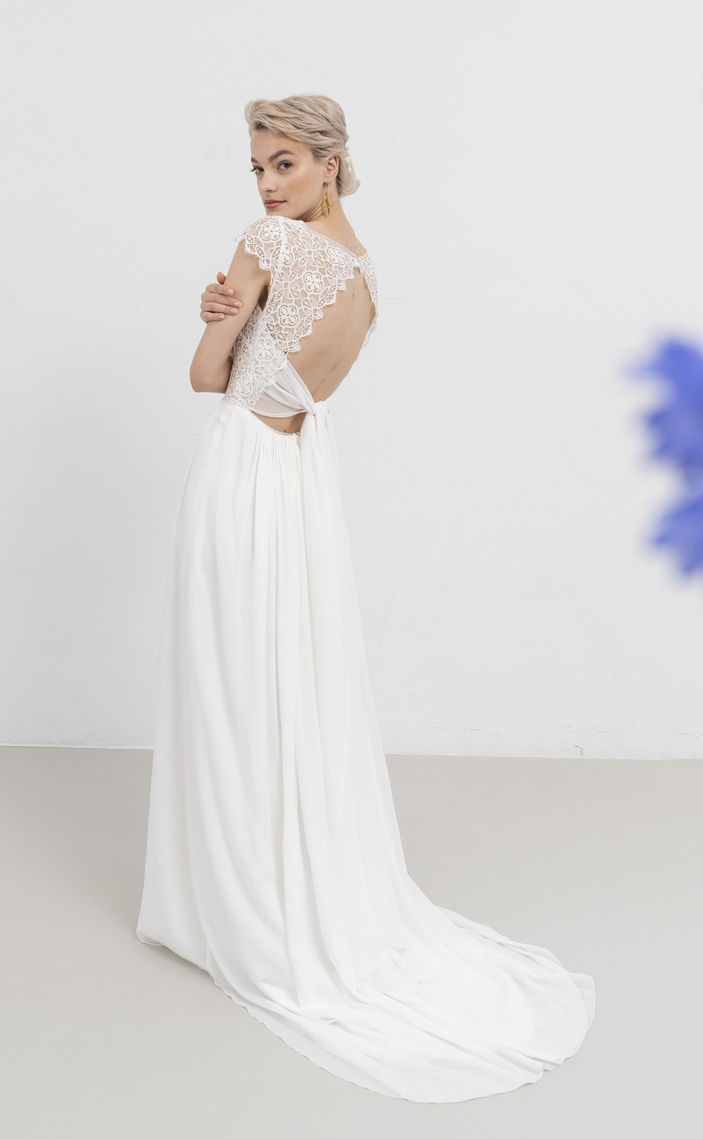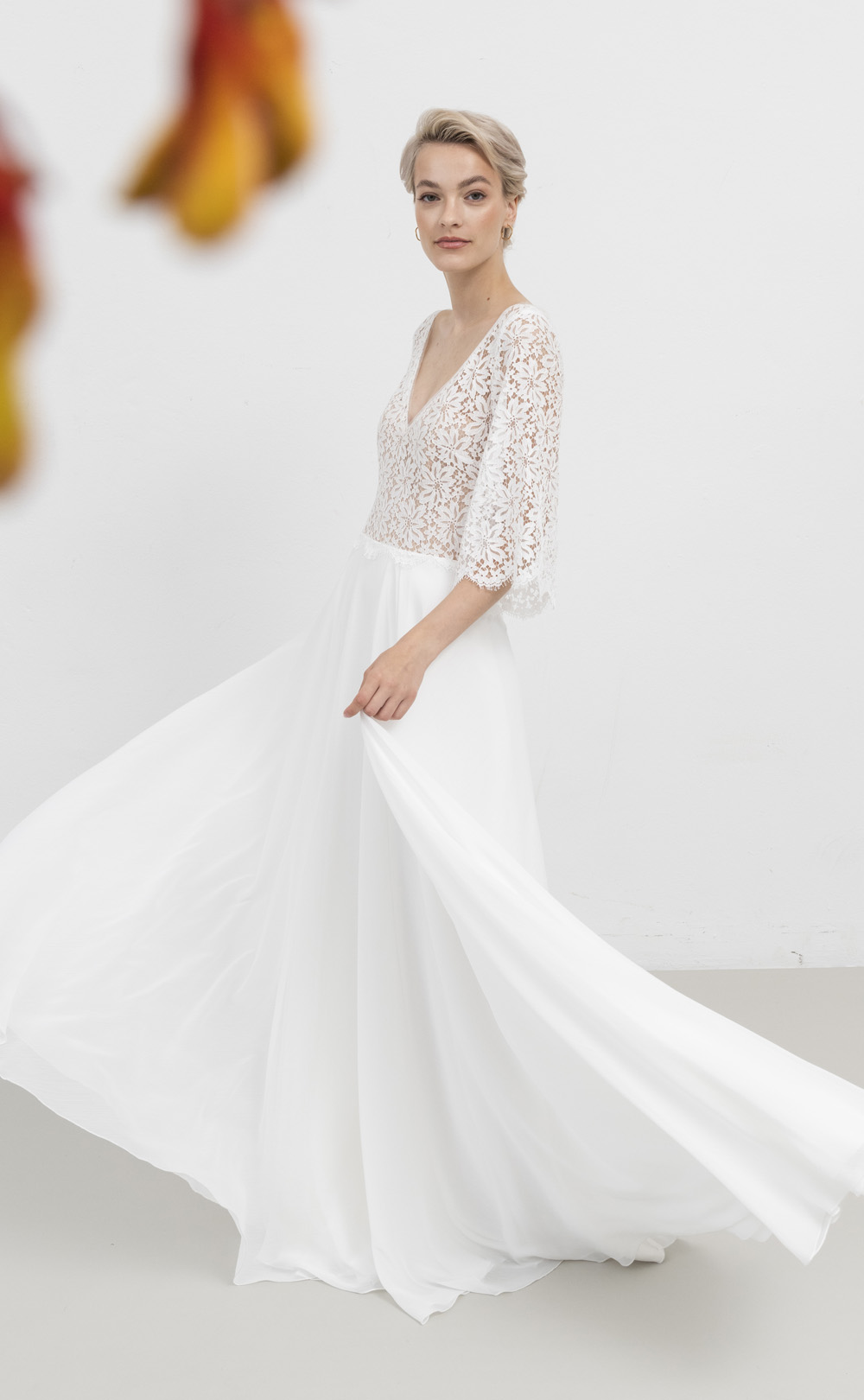 Wir sind immer auf der Suche nach innovativen Stoffen für unsere nachhaltigen Brautkleider und haben seit einigen Jahren Kleider aus Stoffen, die aus recycelten PET-Flaschen gewoben sind. Das hört sich ein wenig verrückt an, aber der Stoff ist wunderbar fließend und weich, wie z.B. in unserem Kleid Isis Georgia. Schonend verarbeitete Viskose (wie z.B. unsere Ama), auch recycelte Polyester-Materialien (wie z.B. unser Belle Sleeve Dress) und moderner Tencel (wie z.B. unser Najuma Tree) finden sich in der Kollektion, sowie GOTS-zertifizierte Spitzen (wie z.B. unser Lace Flower Bow Dress). Viele unserer Kleider sind übrigens auch vegan.