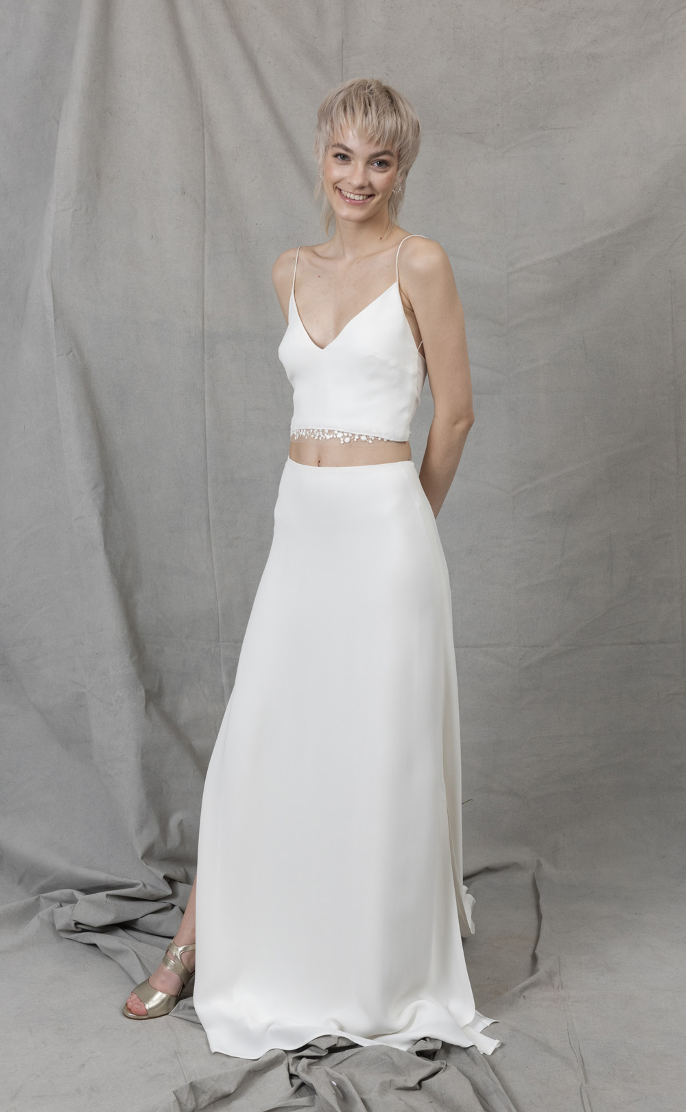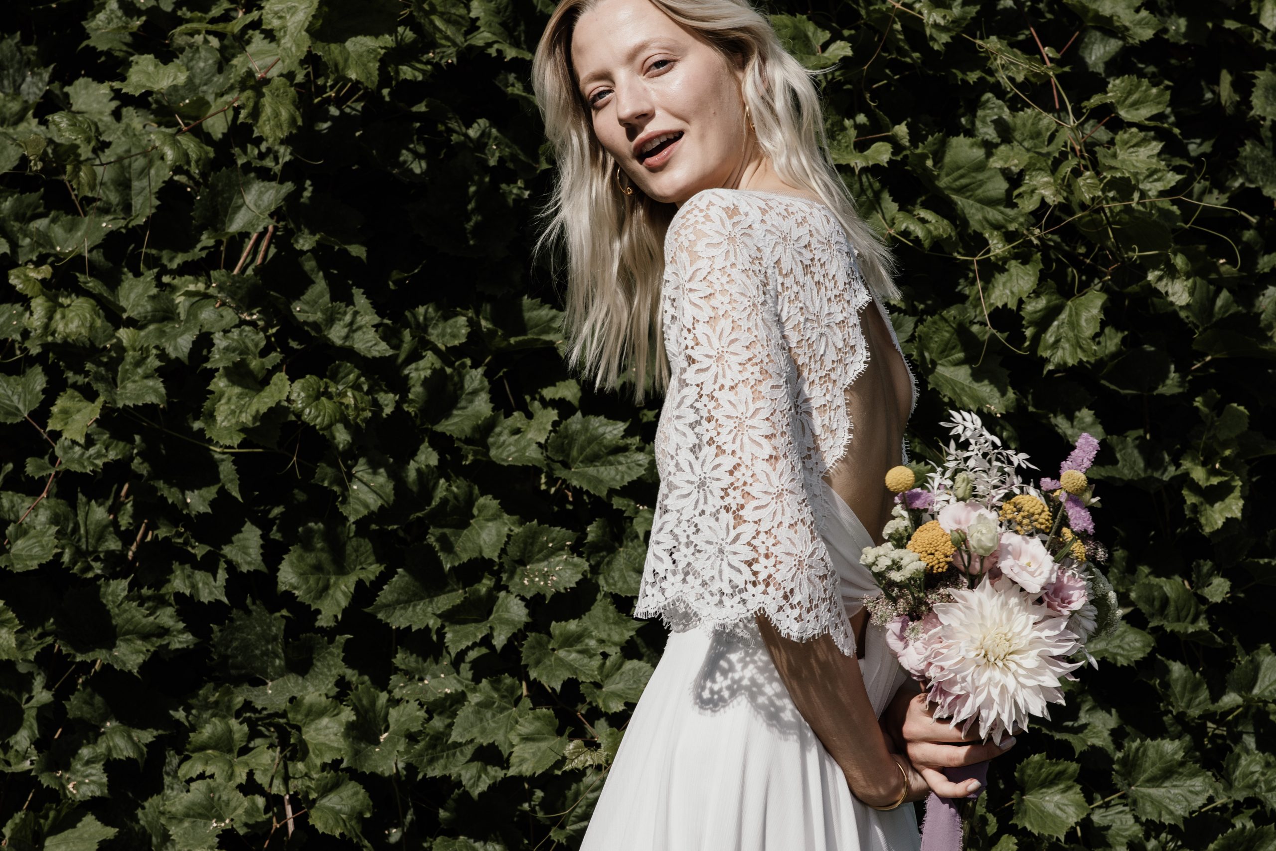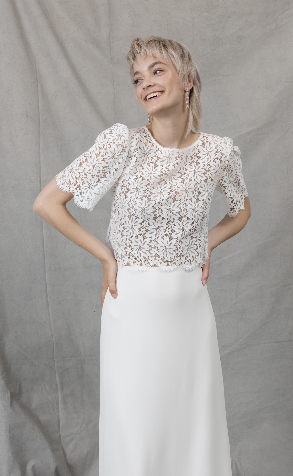 Eine weitere Idee Dein Brautoutfit nachhaltiger zu gestalten, ist der Gedanke der Wiederverwendung. Einen modernen Zweiteiler, wie unser Million Dots Top mit Georgie Skirt kannst Du wunderbar auch nach der Hochzeit noch tragen. Tops und Pullis passen wunderbar auch zur Jeans.
