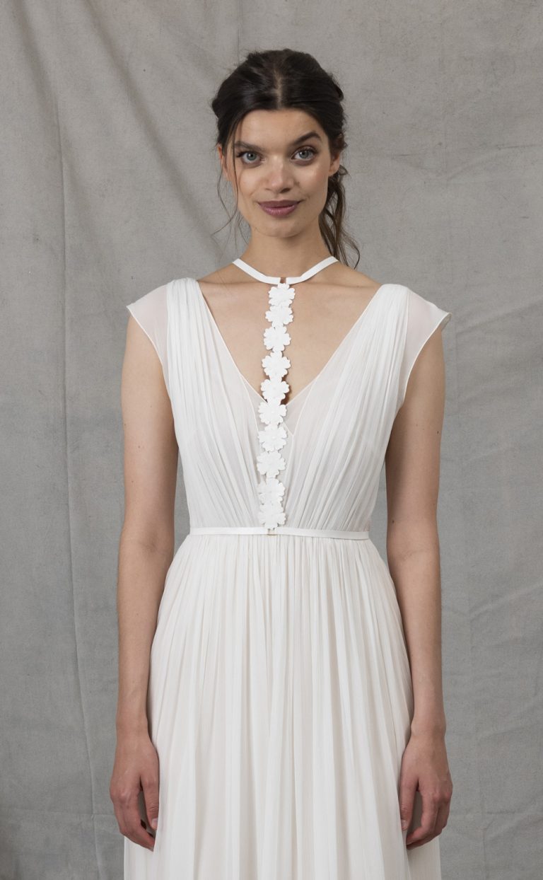 The harness fits perfectly on pure dresses, like the Pure Chiffon Dress (photo 1-2) or on dresses with modern lace, like Neema Bordure ( photo 3 -4 ). But you can also style it on plain jumpers and T-shirts even after the wedding.