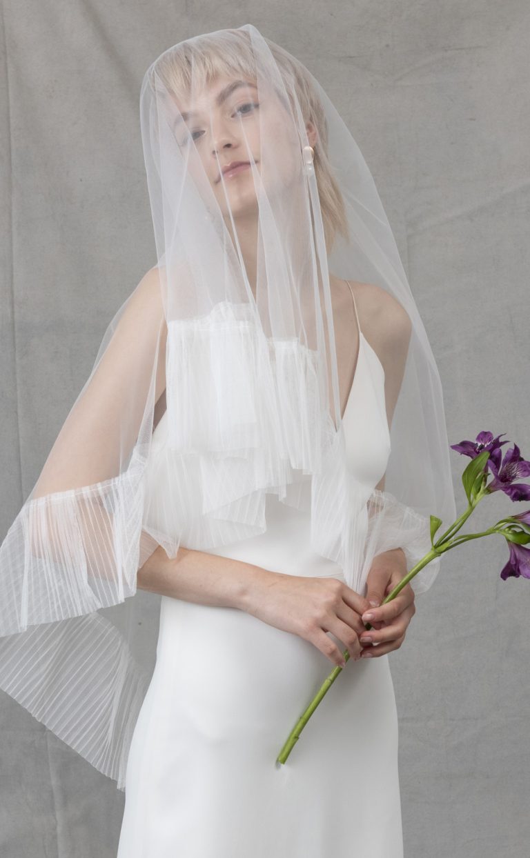A wide pleated tulle border frames the entire veil, modern and pure. The veil goes perfectly with simple dresses like our Ama (photo 1 and 2) or with the wedding dress Haiba (photos 3 and 4), which features details in the same tulle – a perfect combination.