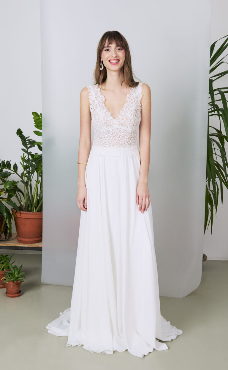 This wedding dress is perfect for brides who want to combine romance and modernity on their big day. Whether for an outdoor wedding or a formal venue, this gown, with its playful lace and sleek crepe fabric, will make any bride shine. The design also ensures optimal comfort and freedom of movement, making it ideal for brides who want an unforgettable entrance while maintaining ease and elegance.