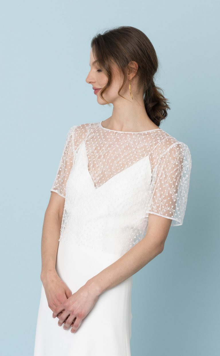 Das Top „Cosmic Velvet“ ist ein super schönes, romantisches Brauttop aus französischer Spitze.