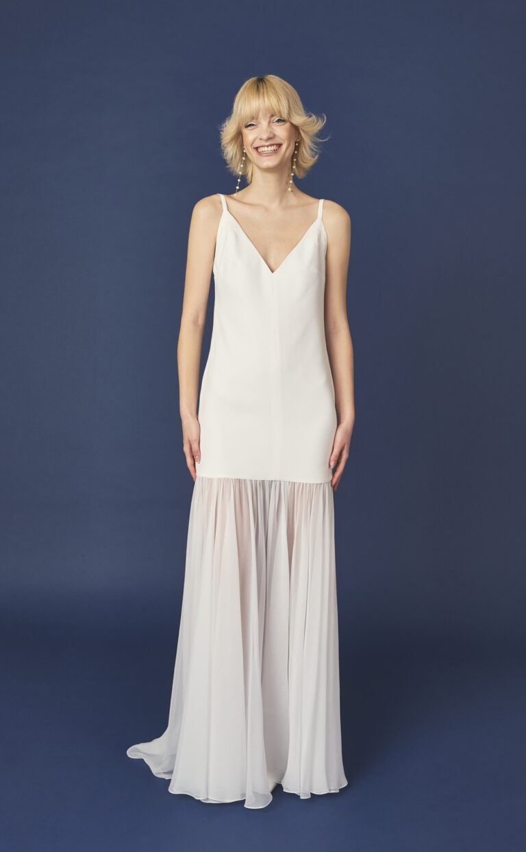 Das Brautkleid „Lore“ strahlt durch seine zeitlose Eleganz und moderne Raffinesse. Der sanft fließende Stoff – italienische Viskose- umschmeichelt die Silhouette und verleiht der Braut eine mühelose Leichtigkeit. Der tiefe V-Ausschnitt im Vorderteil setzt ein dezentes, feminines Highlight, während der schmale Schnitt die Figur optimal zur Geltung bringt.
