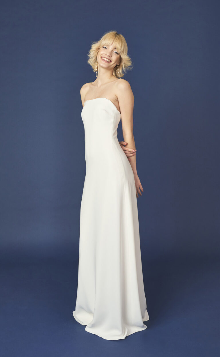 Das Brautkleid Esmara ist die ideale Wahl für Bräute, die sich einen modernen und minimalistischen Look wünschen. Das Kleid besticht durch seine schlichte Eleganz und betont die natürliche Schönheit der Trägerin.