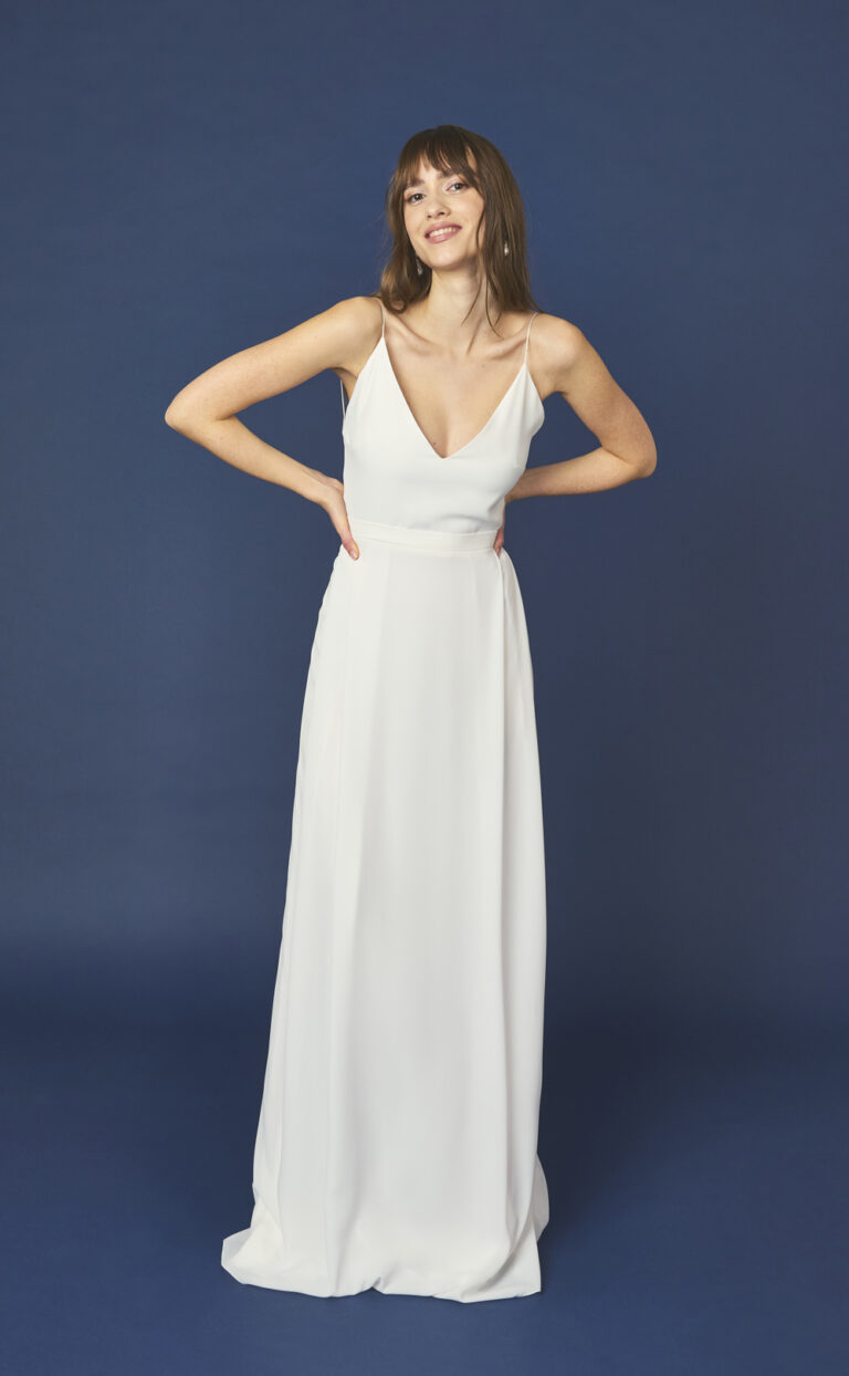Das Brautkleid „Isis Georgia“ vereint zeitlose Eleganz mit einem modernen, nachhaltigen Designanspruch. Die schlanke Silhouette dieses Kleides wird durch filigrane Spaghettiträger und einen tiefen V-Ausschnitt vorne definiert, der eine subtile Weiblichkeit ausstrahlt. Der fließende Rock mit Schleppe verleiht dem Kleid eine mühelose Eleganz und sorgt für einen traumhaften Auftritt am Hochzeitstag.