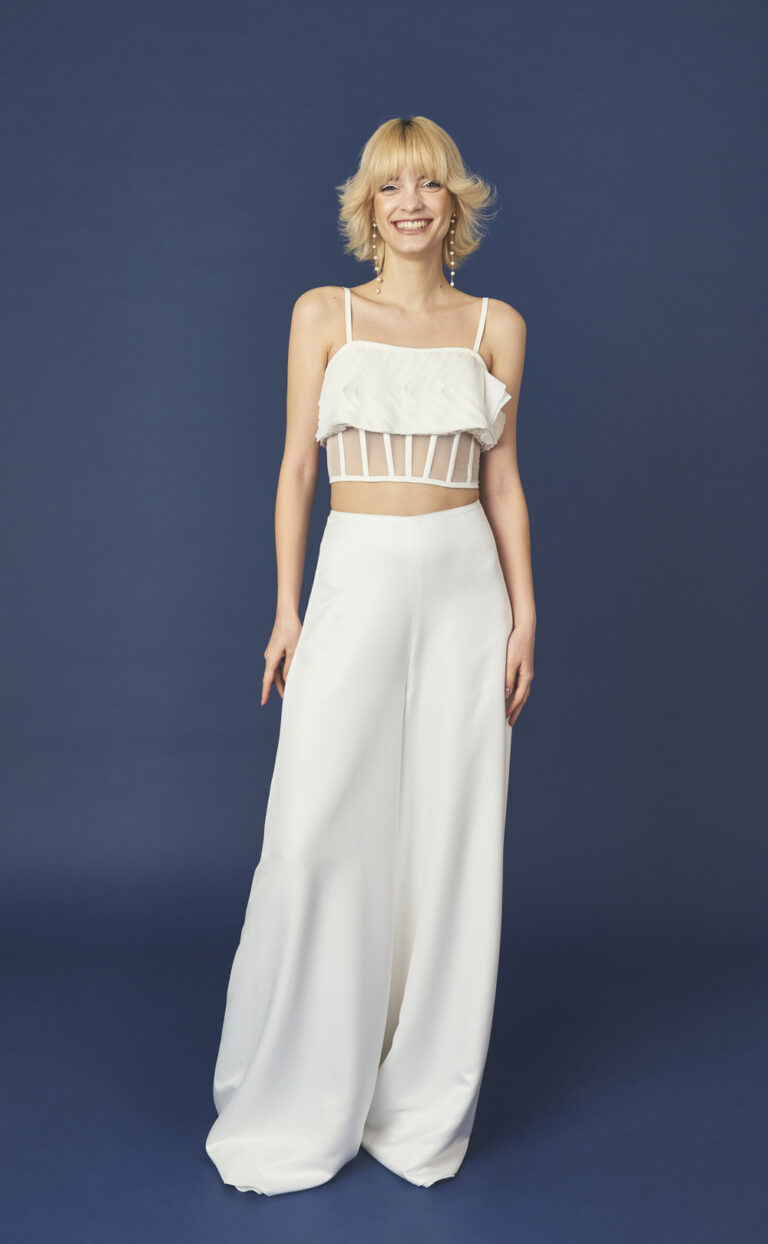 Der zweite Teil dieses Outfits, die Hose Pure, sind die perfekte Ergänzung zum femininen Oberteil. Sie ist aus einer superweichen italienischen Seide-Viskose-Mischung gefertigt. Die weite, fließende Passform dieser Hose verleiht der Braut einen modernen und dennoch mühelosen Look. Der schlichte Schnitt der Hose bringt die Eleganz und Bewegung des Stoffes perfekt zur Geltung, während die hohe Taille für eine schmeichelhafte Silhouette sorgt. Diese Kombination aus Top und Hose bietet nicht nur stilvolle Bewegungsfreiheit, sondern setzt auch ein klares Statement für Bräute, die dem klassischen Hochzeitskleid den Rücken kehren und auf etwas Neues setzen wollen.