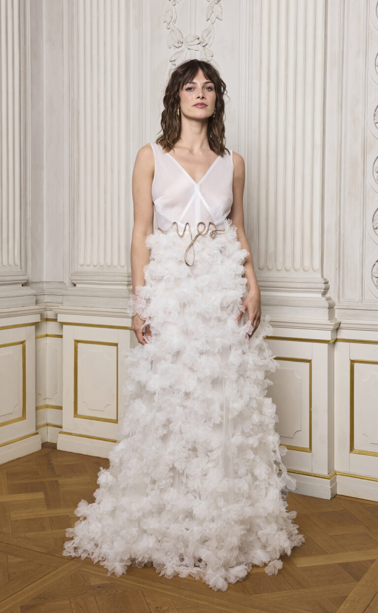 Das Blossom Burst Dress ist ein modernes Brautkleid voller Leichtigkeit und Kreativität. Das schlichte, zart gestreifte Oberteil mit tiefem V-Ausschnitt trifft auf einen voluminösen Rock, der über und über mit dreidimensionalen Blüten aus feinem Organza gearbeitet ist. So entsteht ein romantisches Brautkleid, das verspielt und gleichzeitig absolut modern und trendy wirkt.