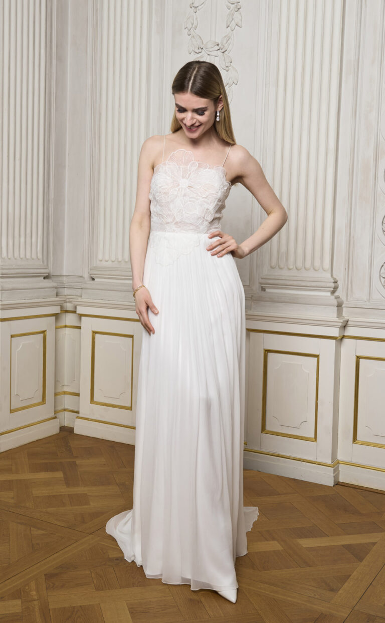 Der weich fließende Rock aus Seidenchiffon verleiht dem Kleid eine luftige Leichtigkeit und eine moderne, zeitlose Ausstrahlung. Perfekt für Bräute, die ein schlichtes Brautkleid suchen, das trotzdem voller Details steckt und mit eleganter Zurückhaltung überzeugt.