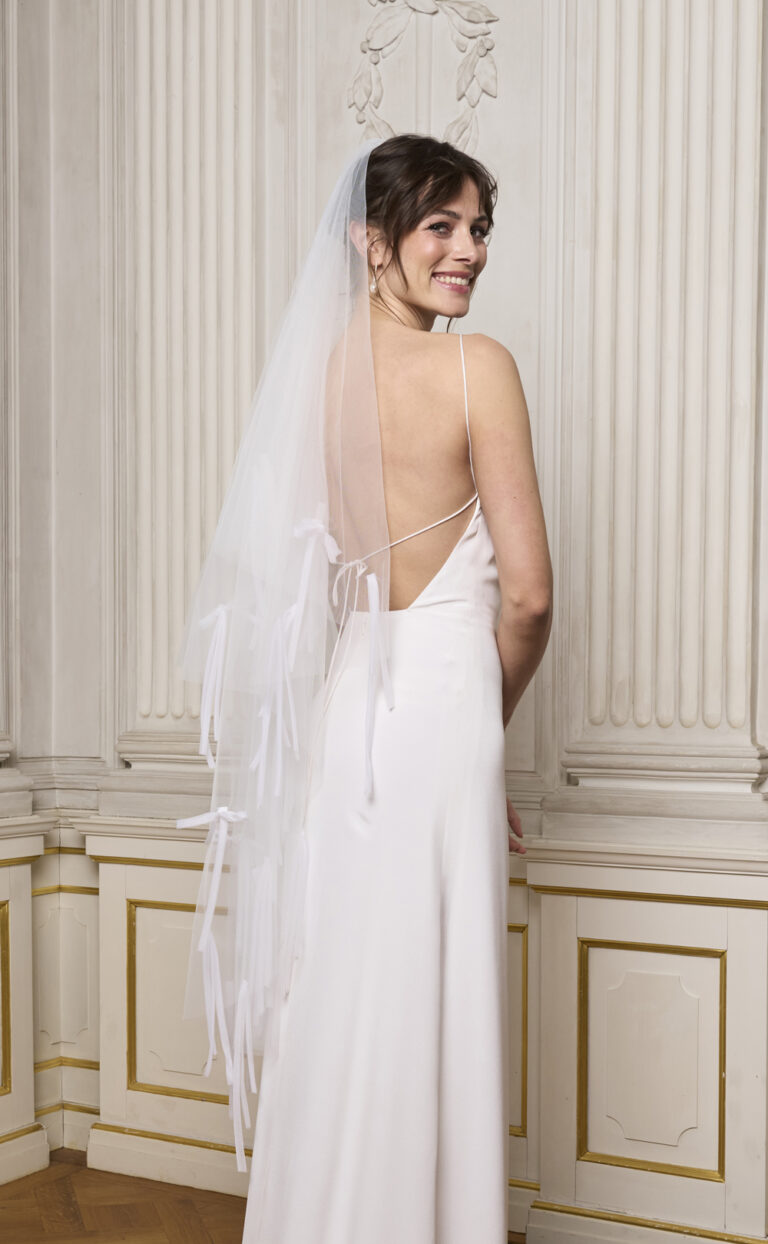 Der Schleier ist vielseitig kombinierbar und passt perfekt zu cleanen Brautkleidern, denen er eine verspielte Note verleiht. Auf den Bildern wird der Tova Bow Veil mit dem Kleid Soft-Silk-Elen gestylt, das durch den Schleier einen modernen Twist erhält.