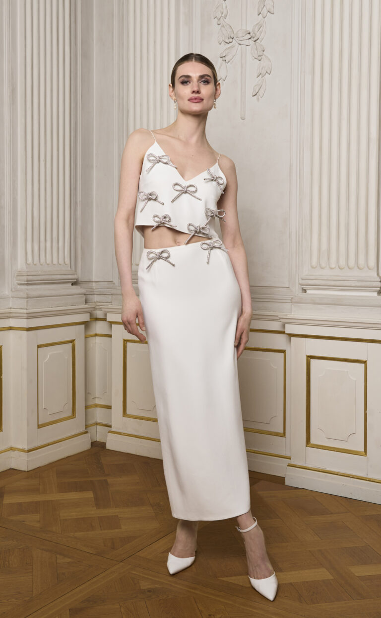 Der Glitter Bow Look ist pure Extravaganz für moderne Bräute, die ein echtes Fashion-Statement setzen möchten. Gefertigt aus einem luxuriösen italienischen Viskose-Stretch, begeistert er durch seine klare, moderne Silhouette und die verspielten Glitzer-Schleifen, die wie kleine Schmuckstücke über Top und Rock verteilt sind.