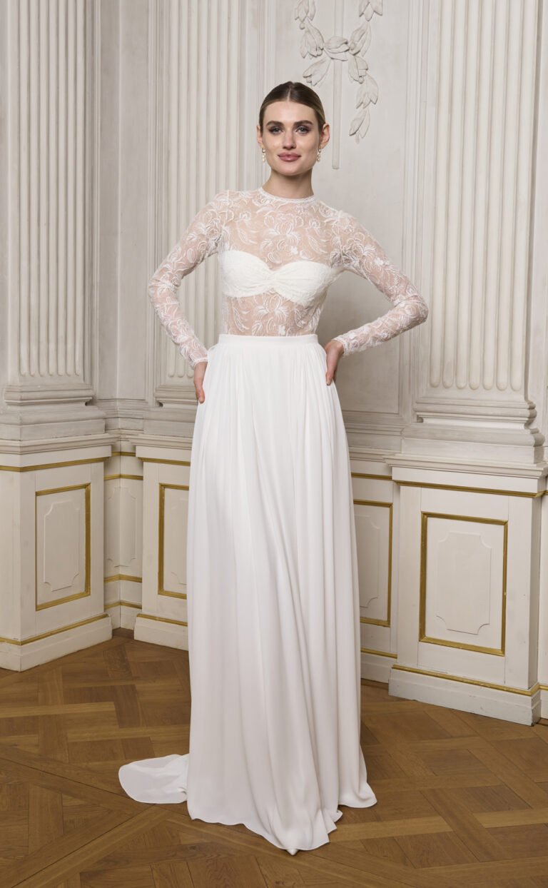 Der Helira Body ist aus feiner französischer Stretch-Spitze gefertigt und vereint sinnliche Transparenz mit modernem Tragekomfort. Ein besonderes Detail: Das geraffte Bustier im Vorderteil kann mit kleinen Knöpfen herausgenommen werden – so lässt sich der Look von zart bedeckt bis aufregend transparent variieren. Die langen Ärmel aus floraler Spitze unterstreichen die elegante Leichtigkeit und machen den Body zu einem echten Highlight moderner Brautmode.