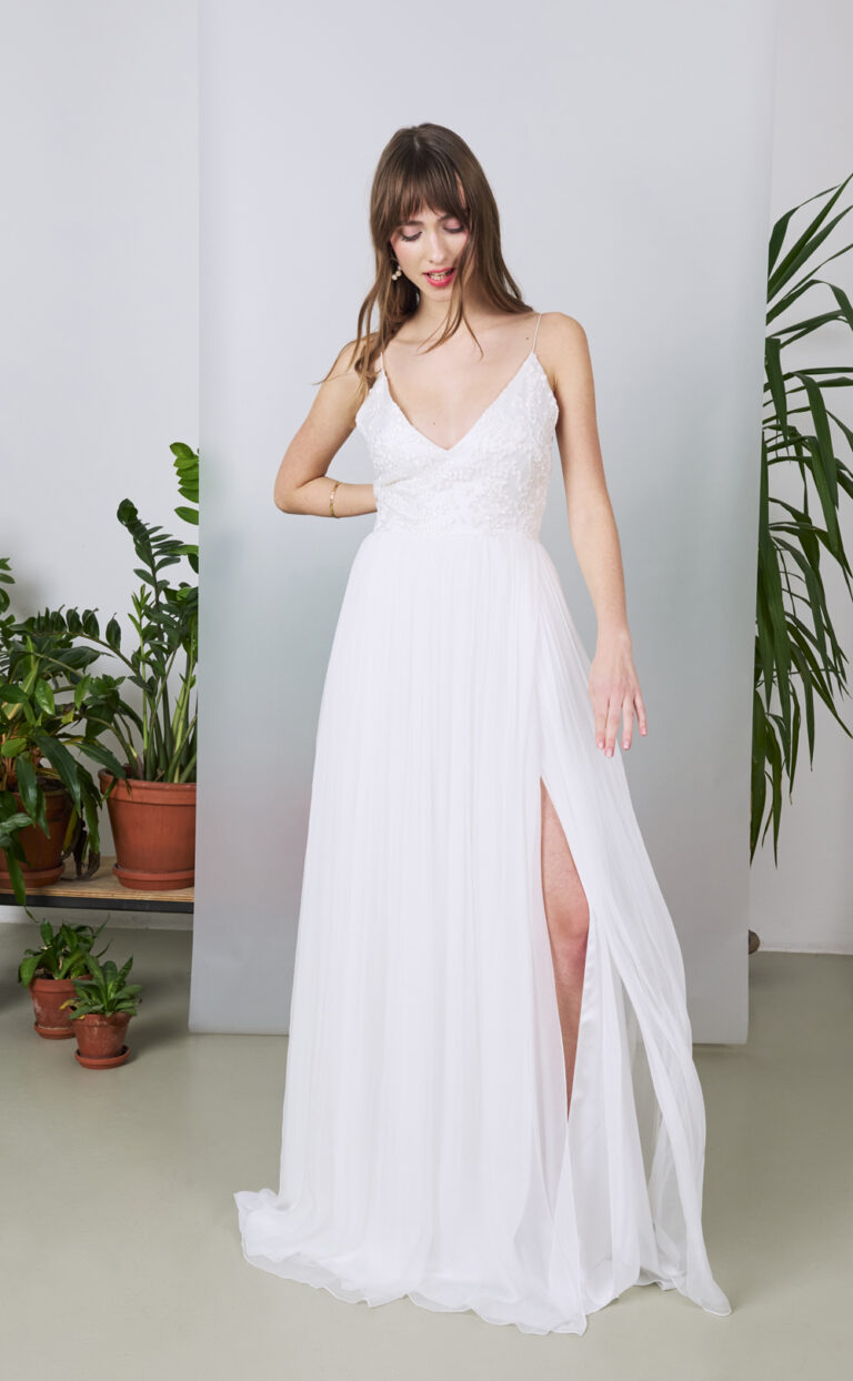 Die Rückseite des Kleides sorgt mit ihrem tiefen V-Ausschnitt und der Semi-Transparenz für einen besonderen Wow-Effekt. Ein weicher Tüll mit tausenden Pünktchen verleihen dem Oberteil eine verspielte Note, während die schlicht fließende Silhouette durch ihre Eleganz überzeugt. Der weich fallende Stoff umhüllt die Braut sanft und sorgt für ein angenehmes Tragegefühl.