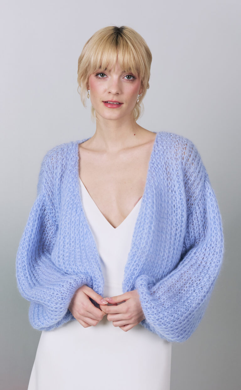Die lockere Strickjacke ist das ideale Brautaccessoire für modeaffine Bräute und um das „Something Blue“ auf schöne Art in deinem Brautlook zu ergänzen.