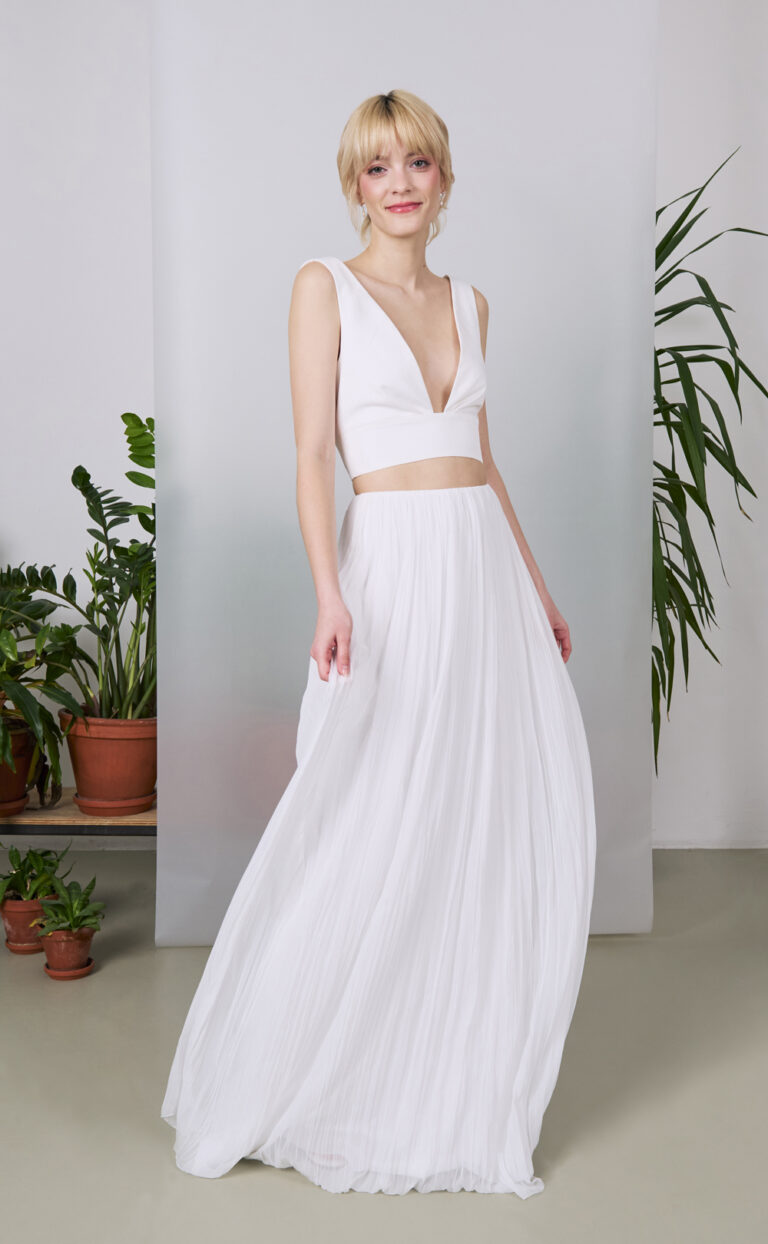 Das Elowyn Top und der Plissee Rock ist die perfekte Wahl für Bräute, die modernen Minimalismus und elegante Raffinesse kombinieren möchten. Dieses zweiteilige Brautoutfit bietet eine frische Alternative zum traditionellen Brautkleid und ist ideal für Bräute, die einen individuellen Look an ihrem großen Tag suchen.