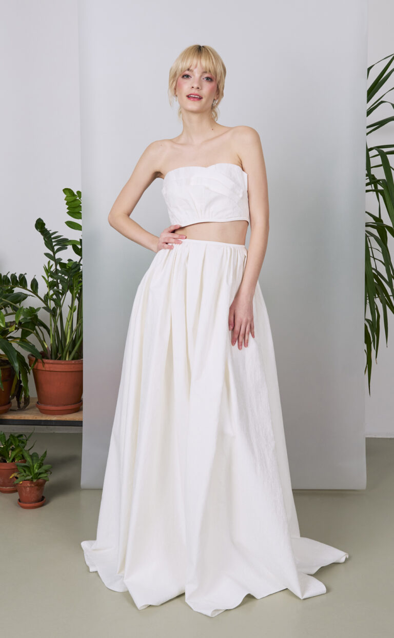 Dieser zweiteilige Brautlook ist ideal für die moderne Braut, die sowohl klassisch als auch zeitgemäß auftreten möchte. Die Kombination aus schlichter Form und raffinierten Details verleiht dem Brautoutfit eine besondere Vielseitigkeit. Sowohl das Top als auch der Rock sind minimalistisch gestaltet, dennoch strahlt der gesamte Look pure Eleganz und Raffinesse aus.