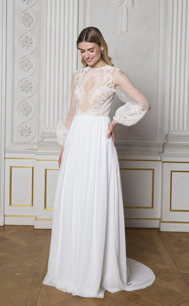 Das Boho Dots Pure Brautkleid ist die perfekte Wahl für Bräute, die von einem romantischen und zugleich modernen Hochzeitslook träumen. Das transparente Oberteil aus feiner italienischer Tüllspitze mit zarten Pünktchen-Details sorgt für einen verspielten und femininen Akzent, während die leicht voluminösen Ärmel dem Kleid eine bohemian-inspirierte Eleganz verleihen. Der tiefe Rückenausschnitt bringt eine sinnliche Note ins Design und lässt das Kleid zugleich leicht und modern wirken.