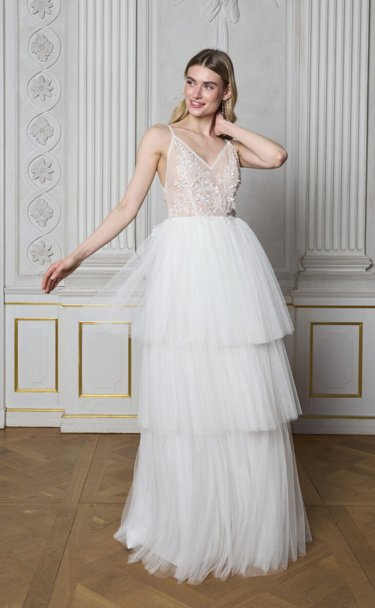 Der mehrlagige Tüllrock fällt luftig und leicht in Stufen und bringt so Bewegung und ein modernes Volumen ins Kleid. Ideal für Sommerhochzeiten, freie Trauungen oder jede Braut, die sich einen unbeschwerten und femininen Auftritt wünscht.