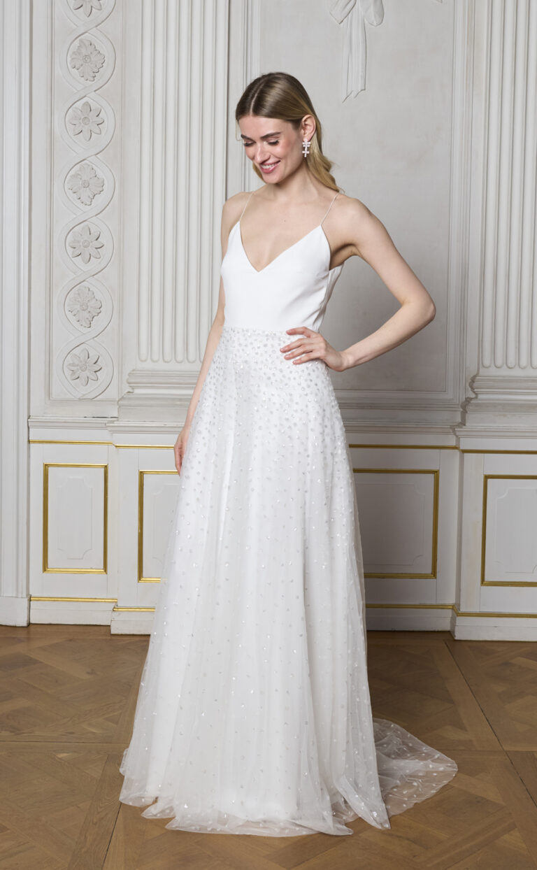 Für noch mehr Kombinationsmöglichkeiten gibt es das Shiny Jasmin Top und die Shiny Jasmin Jacket. Beide lassen sich perfekt mit dem Kleid kombinieren und bieten Bräuten die Freiheit, ihren Look individuell zu gestalten – von elegant reduziert bis hin zu glamourös funkelnd.