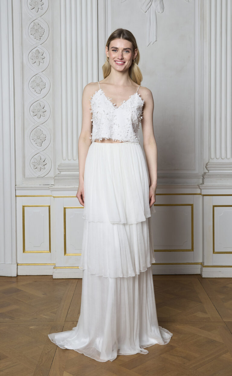 Das Maellis Top ist aus der gleichen romantischen französischen Tüllspitze gefertigt wie das Maellis Brautkleid und bezaubert durch seine zarten, floralen 3D-Applikationen. Mit den feinen Spaghettiträgern und dem leicht verkürzten Schnitt wirkt es modern, feminin und zugleich leicht verspielt – perfekt für Bräute, die einen zweiteiligen Brautlook suchen.