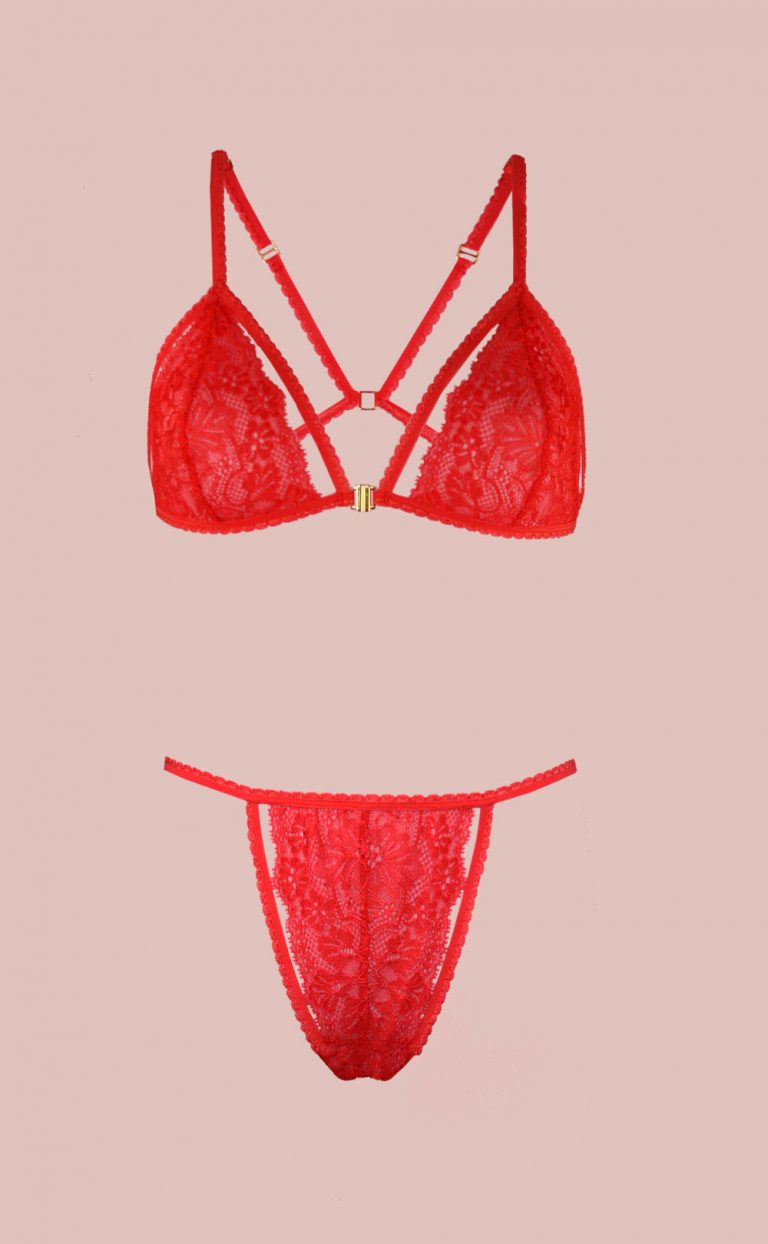 Der Triangle-Bh aus französischer Spitze in der Farbe Lucky Red ist filigran und sexy. Das rote Gummiband ist nur teilweise an der Spitze fixiert, sodass ein wenig Haut immer durchblitzen kann. Der passende Tanga-Slip ist, wie der Bh, ebenso mit rotem Gummi  eingefasst und läßt aufregend den Blick auf Hautpartien frei. Im Rücken laufen die Träger hübsch über kreuz und sowohl im Rücken, als auch an den Seiten sind kleine goldene Schmuckteile befestigt. Ein goldener Verschluß hinten und verstellbare Träger machen den Look komplett.