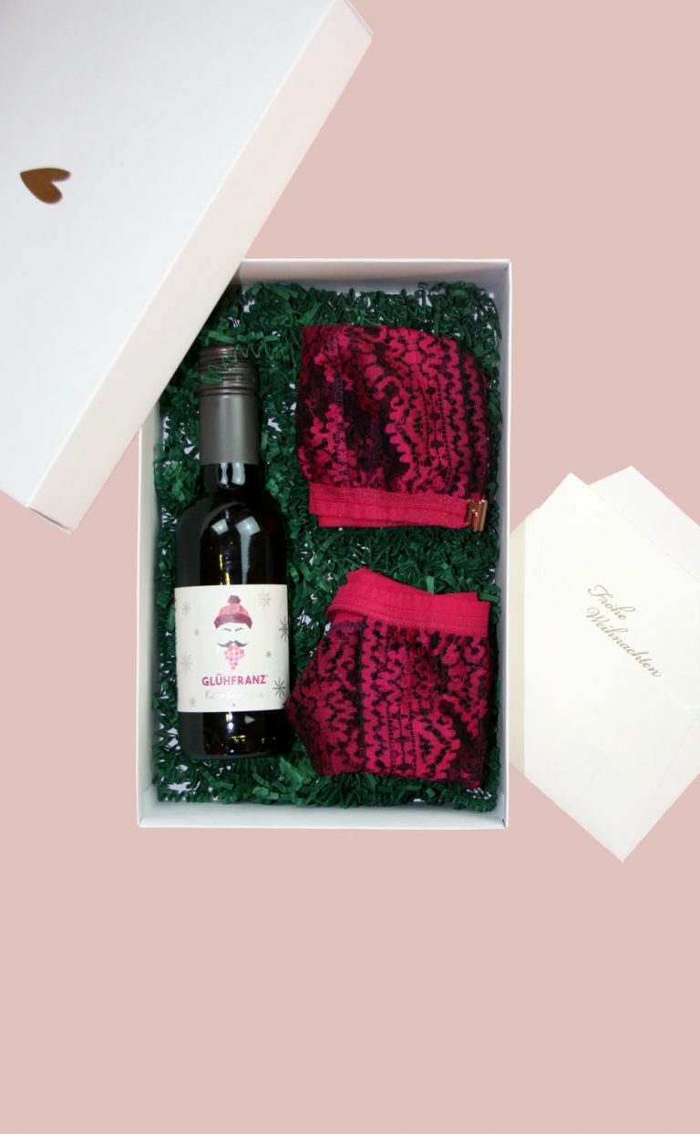 Der Triangle-Bh in den Farbtönen Japanese Plum und Dark Blue Night ist mit einem roségoldenen Verschluß im Dekolleté verziert. Der passende Tanga-Slip ist, wie der Bh, mit einem leicht glänzenden Gummi in Pink eingefasst. Ein toller Kontrast! Dazu gibt es einen veganen Glühwein und eine edle Karte mit einer weihnachtlichen Botschaft. Hübsch verpackt kommt alles in einem schönen weißen Karton mit goldenem Herzprint.