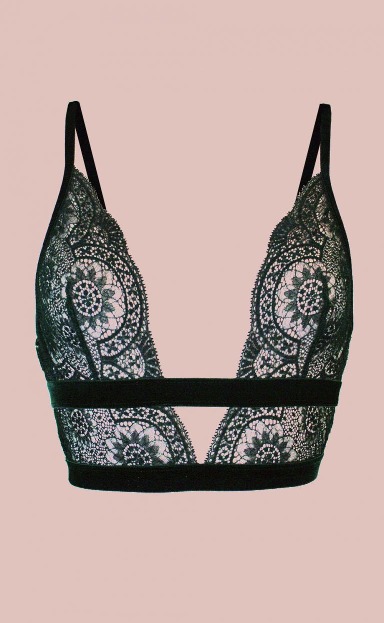 Angelus Nights Top – Zartes schwarzes Triangle-Top aus französischer Spitze mit einem eleganten Blütenmuster. Goldfarbene Versteller setzen einen modernen Akzent. Das elastische Samtband umrahmt die Spitze und gibt einen schönen Abschluß.