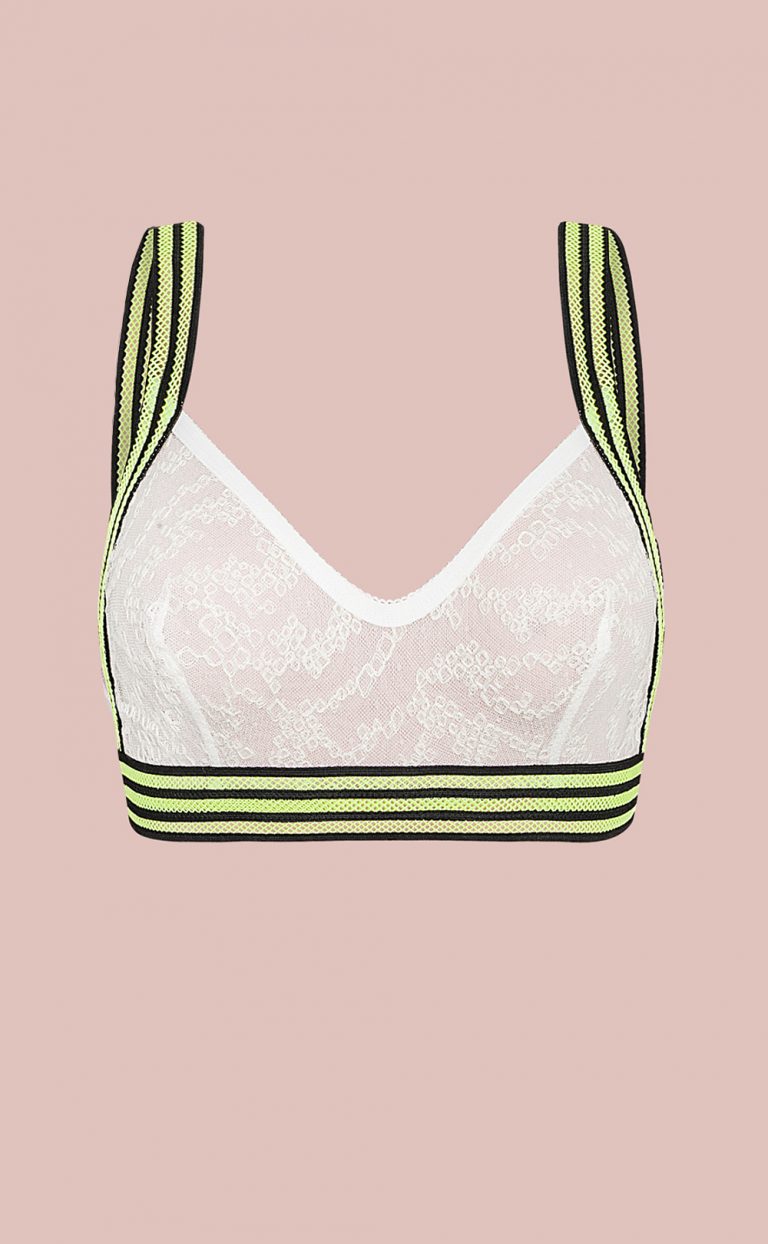 Sportlicher Bh aus zarter französischer Spitze mit einem graphischen Muster. Das breite schwarze Gummi mit Neongrün ist ein großartiger Kontrast.