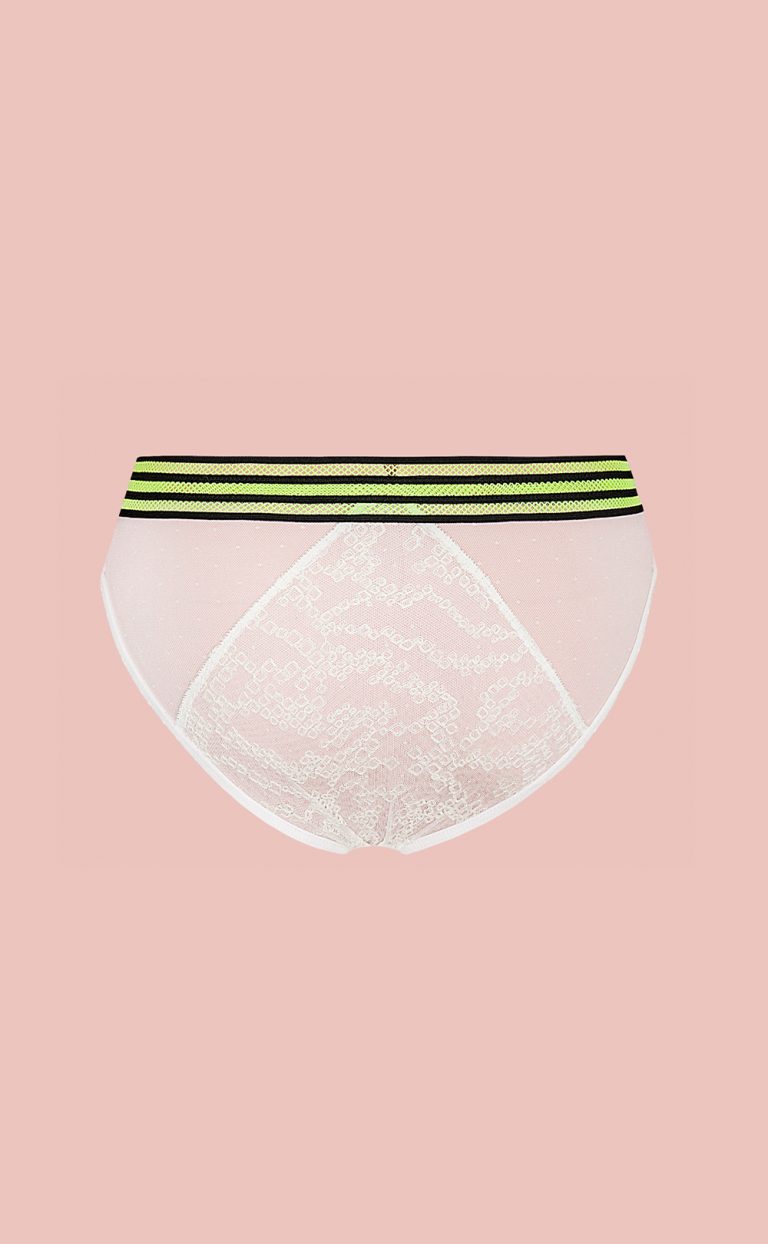 Sportlicher Slip aus zarter französischer Spitze mit Blütenmuster. An den Seiten mit einem zarten Pünktchentüll verarbeitet. Das breite schwarze Gummi mit Neogrün ist ein großartiger Kontrast.