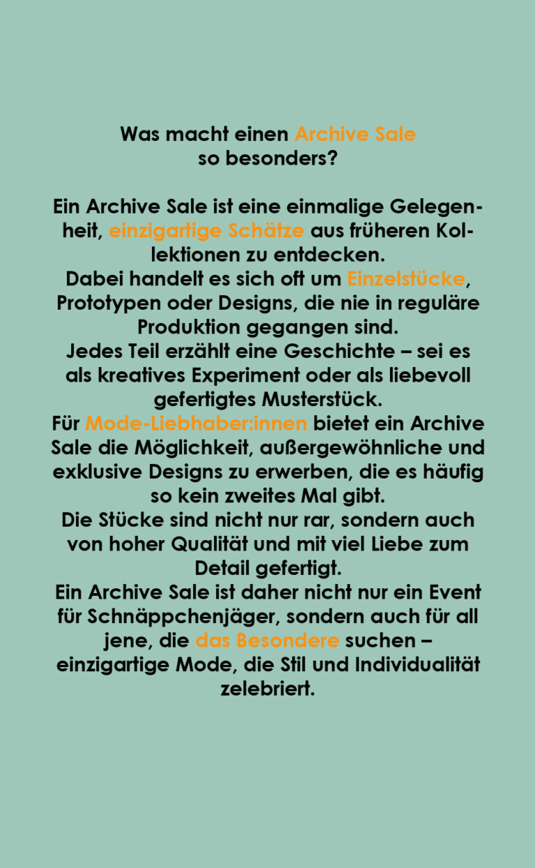 Für Mode-Liebhaber:innen bietet ein Archive Sale die Möglichkeit, außergewöhnliche und exklusive Designs zu erwerben, die es oft so kein zweites Mal gibt. Die Stücke sind nicht nur rar, sondern auch von hoher Qualität und mit viel Liebe zum Detail gefertigt.