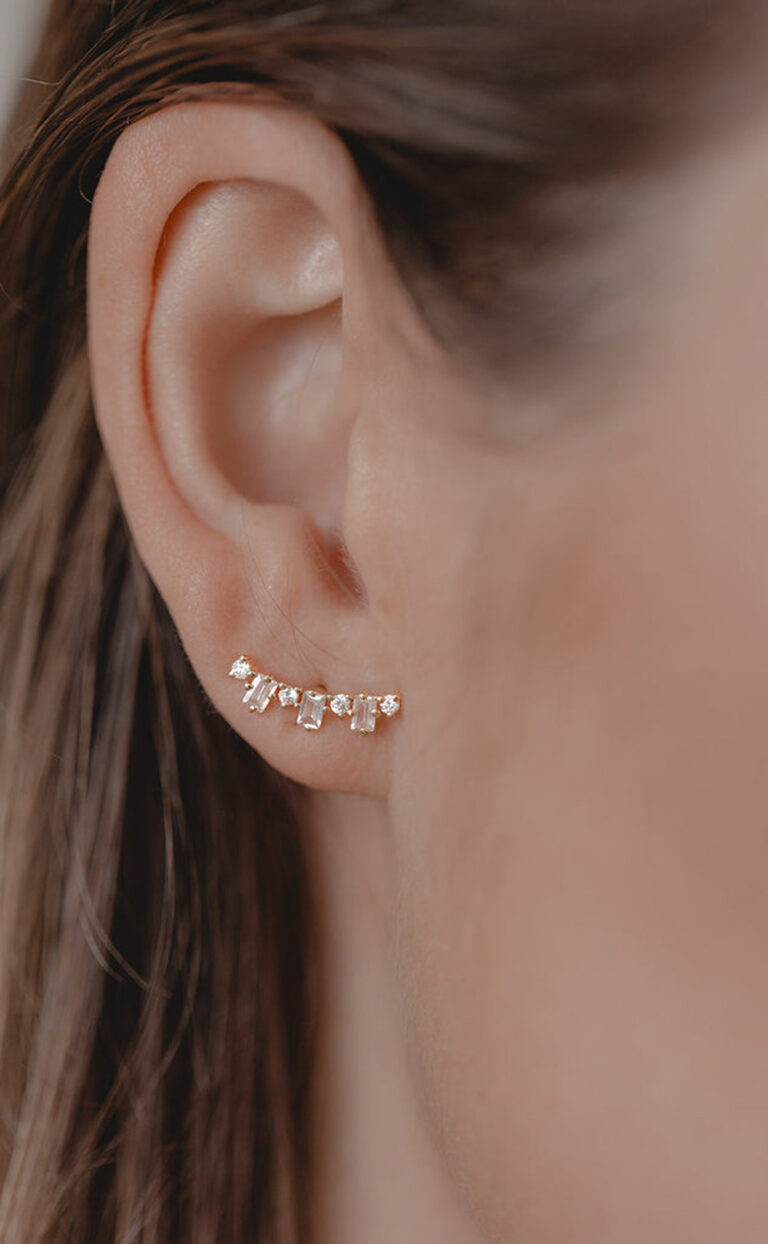 Kleine runde Kristalle und etwas größere Kristalle im Baguette-Schliff reihen sich bei diesen zeitlosen Ohrsteckern harmonisch aneinander. Ihr größtes Talent: Sie passen dank ihrer funkelnd-klaren Form nicht nur zum Brautkleid, sondern lassen sich im Alltag zu jeder Gelegenheit mal klassisch, mal modern perfekt kombinieren.