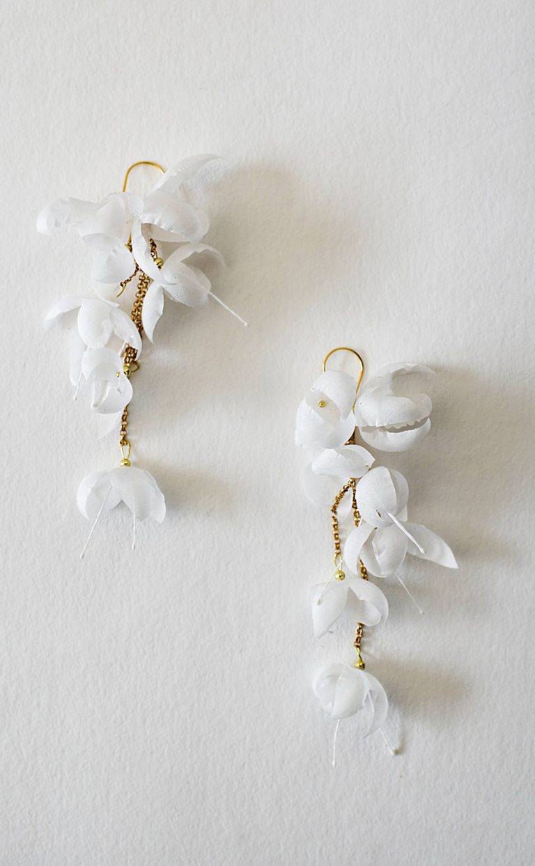 Die Baby Snowdrop Earrings sind zarte Ohrringe inspiriert von feinen Schneeglöckchen. Die perfekten Ohrringe für Deine Frühlingshochzeit. Die Blüten sind aus Seide handgefertigt und mit goldenen Ketten an dem Ohrring befestigt.