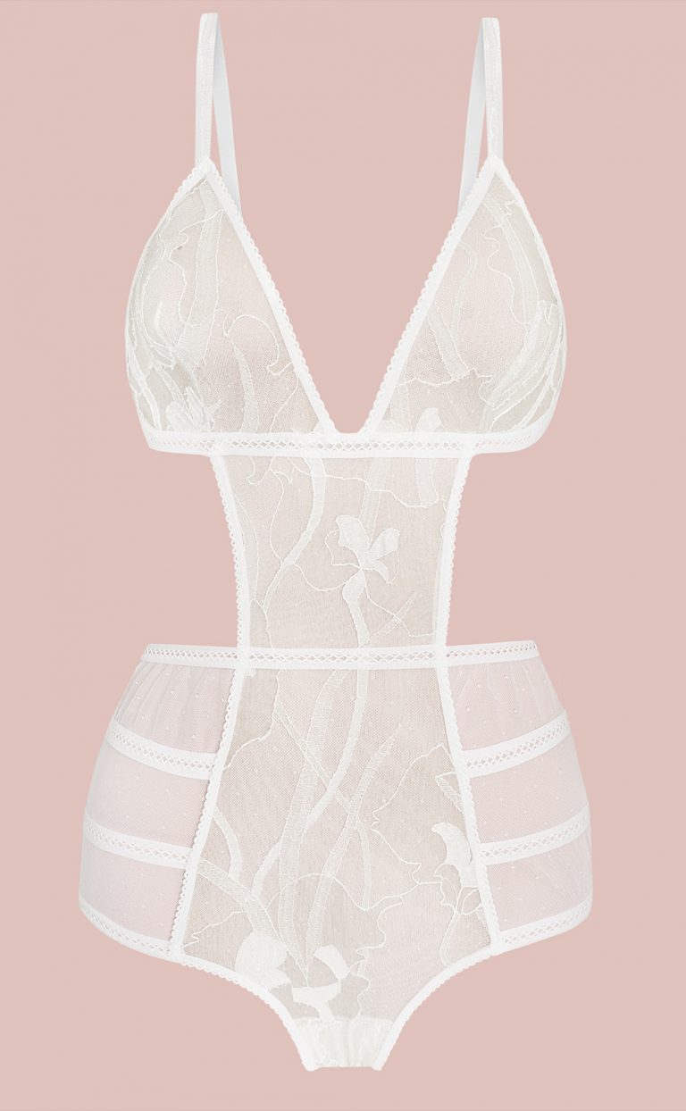 Body aus einer ivory- und nudefarbener französischen Spitze mit einem modernen Blumenmuster und Details aus feinem Pünktchentüll. Alles eingefaßt und akzentuiert mit einem Gummi mit Zackenmuster. Perfekt für eine aufregende Nacht oder um sich einfach nur großartig und gut zu fühlen.