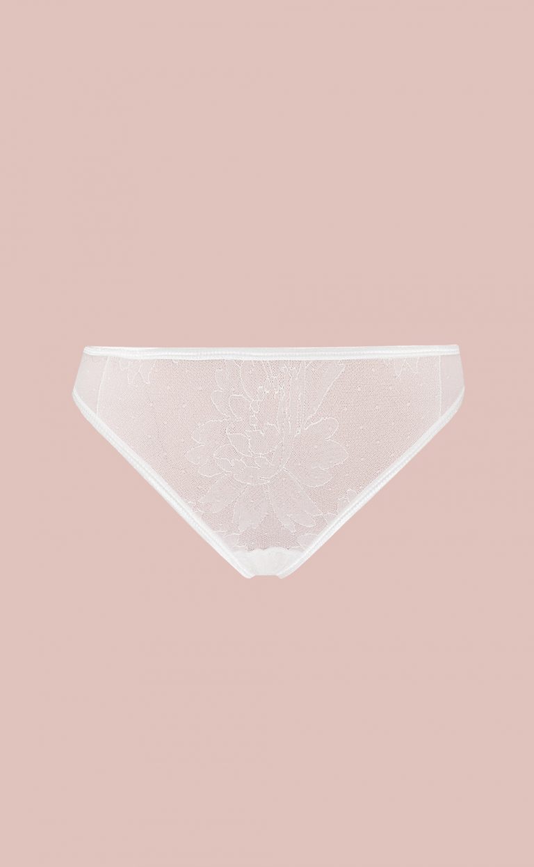 Zarter Slip mit einer feinen Blütenspitze und einem semitransparenten Pünktchentüll.