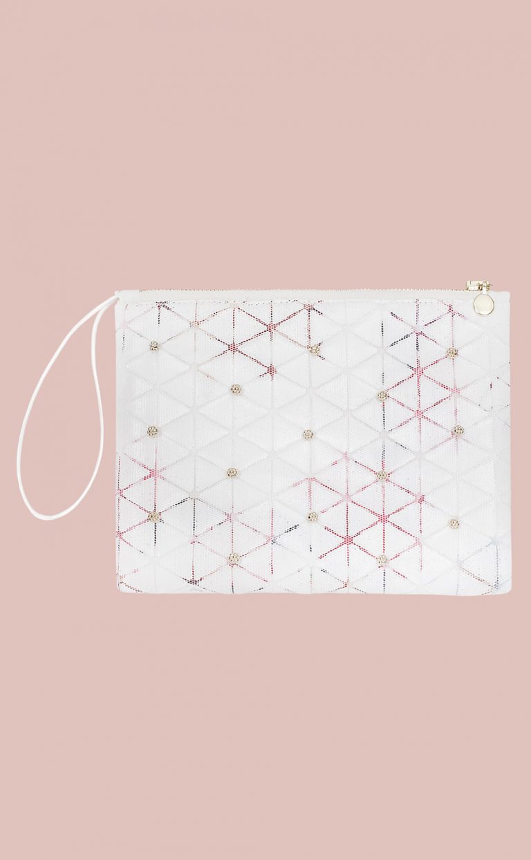 Die opulente Clutch, ist mit einer mit Dreiecken bedruckte Gaze bezogen, diese ist mit einem floralem Print hinterlegt, der leicht durchschimmert. Die Clutch ist auf der Vorderseite mit kleinen goldnen Blütenknöpfen bestickt. More is more!