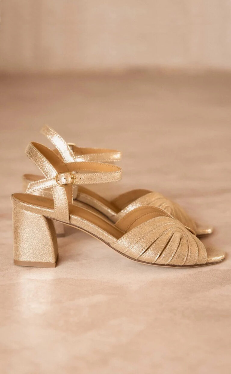 Eileen – Die Sandale ist aus super weichem Laméleder in der Farbe Champagne gold gefertigt. Zarte Bänder in eine Rundung gefaßt sind ein sehr hübsches Detail dieser Schuhe. Perfekt für alle modernen Bräute, die einen schlichten, aber besonderen Brautschuh suchen. Das weiche Leder, die Riemchen und der nicht zu hohe Blockabsatz garantieren Dir den besten Tragekomfort an Deinem Hochzeitstag.