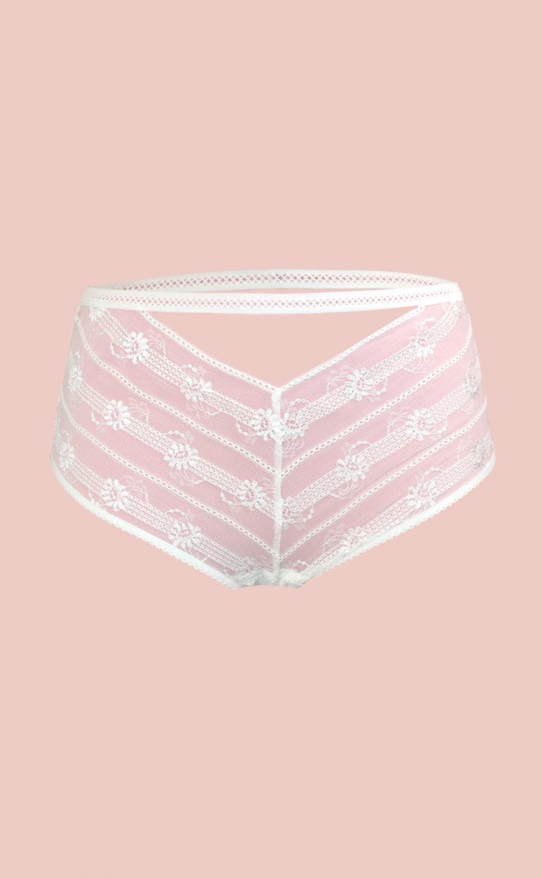 Die Flower and Stripes Panties sind aus zarter französischen Spitze gefertigt. Die Spitze besteht aus einem modernen Blumen- und Streifenmuster. Cut.Outs machen die Panties sexy. Ein schmales Band ziert die Taille.