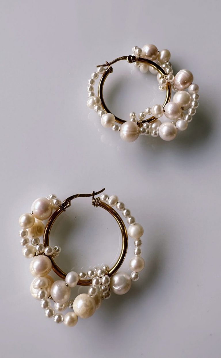 Die Grace Hoops Ohrringe sind moderne Creolen, dekoriert mit verschieden großen Natur- und Süßwasserperlen.