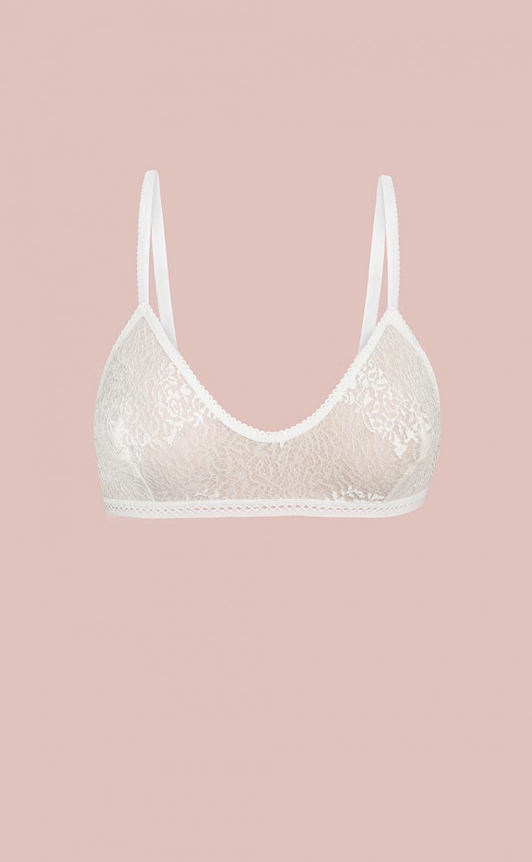 Feiner Bh aus französischer Spitze mit Blütenmuster und wunderbar leichten Glanzeffekten. Versteller in Roségold verzieren die Träger. Ein nudefarbenes Futter erhält die Semitransparenz und gibt mehr Sicherheit.