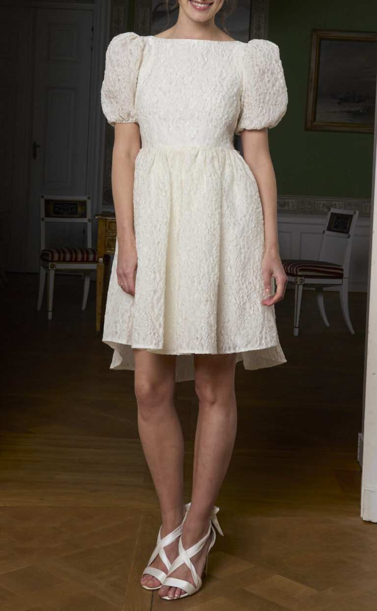 Romantisch, feminin und voller Leichtigkeit: Unser kurzes Brautkleid Lenie verzaubert mit einem strukturierten Stoff, voluminösen Puffärmeln und einem ausgestellten Rock. Die schlichte Vorderansicht im Babydoll-Stil wird durch ein tiefes Rückendekolleté und eine große Schleife zum stilvollen Blickfang. Der zarte Elfenbeinton und die florale Struktur sorgen für einen Hauch Vintage-Flair – perfekt für eine moderne Standesamt-Hochzeit mit Persönlichkeit.