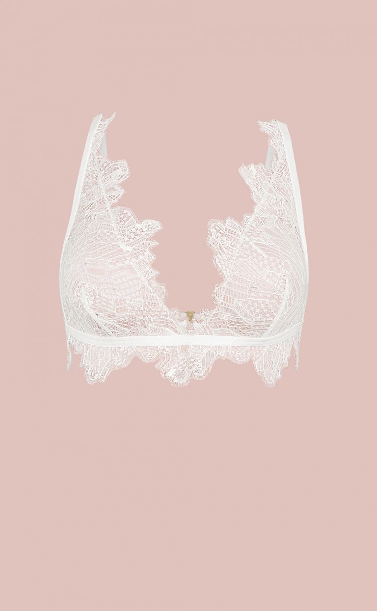 Hoher Triangle-Bh aus französischer Spitze mit einem graphischen Muster. Goldene Versteller zieren die Träger.
