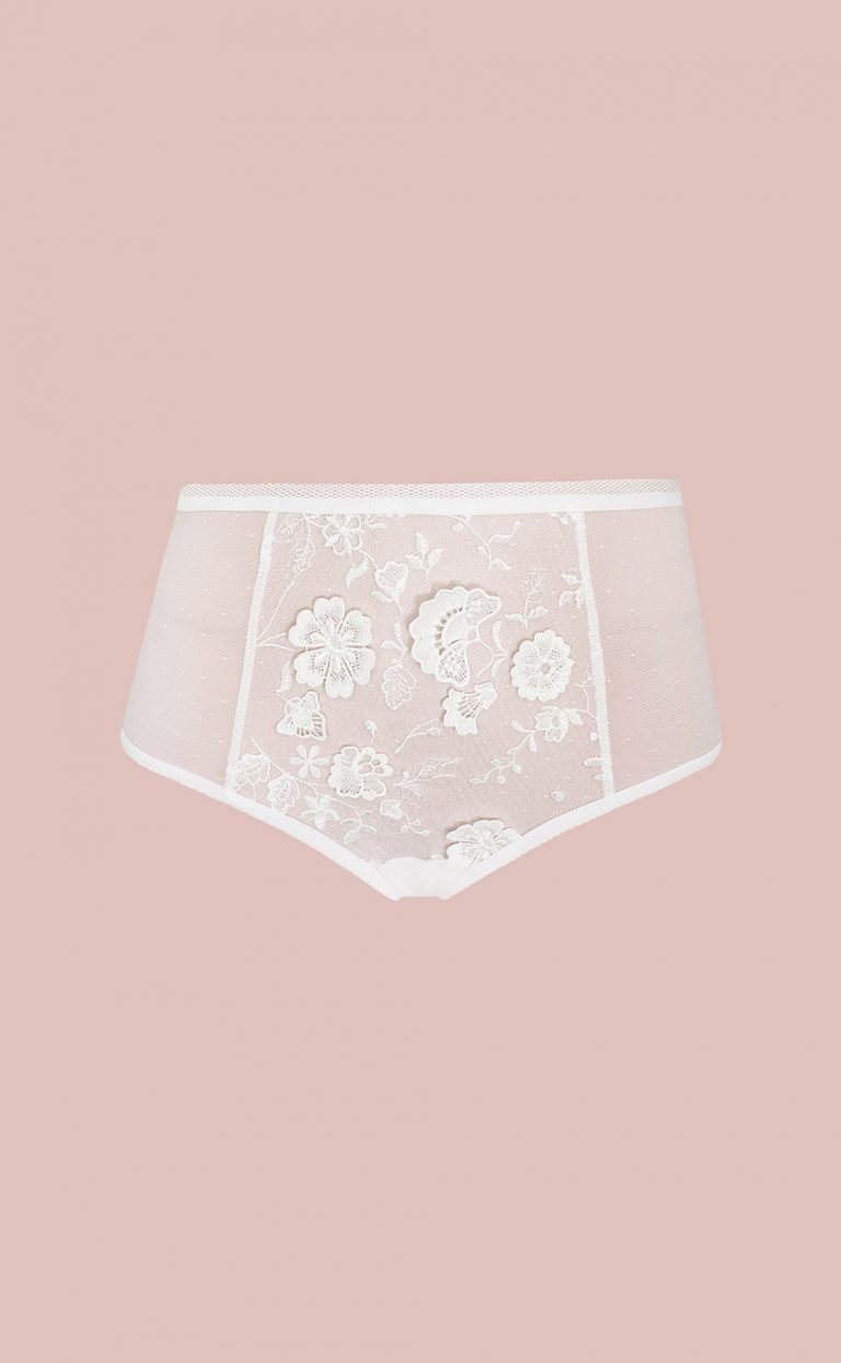 Hohe Pantie aus Tüll mit einer 3-D-Blüten-Bestickung und einem Gummi in Netzoptik. Die Seiten sind aus einem feinen Pünktchentüll gefertigt.