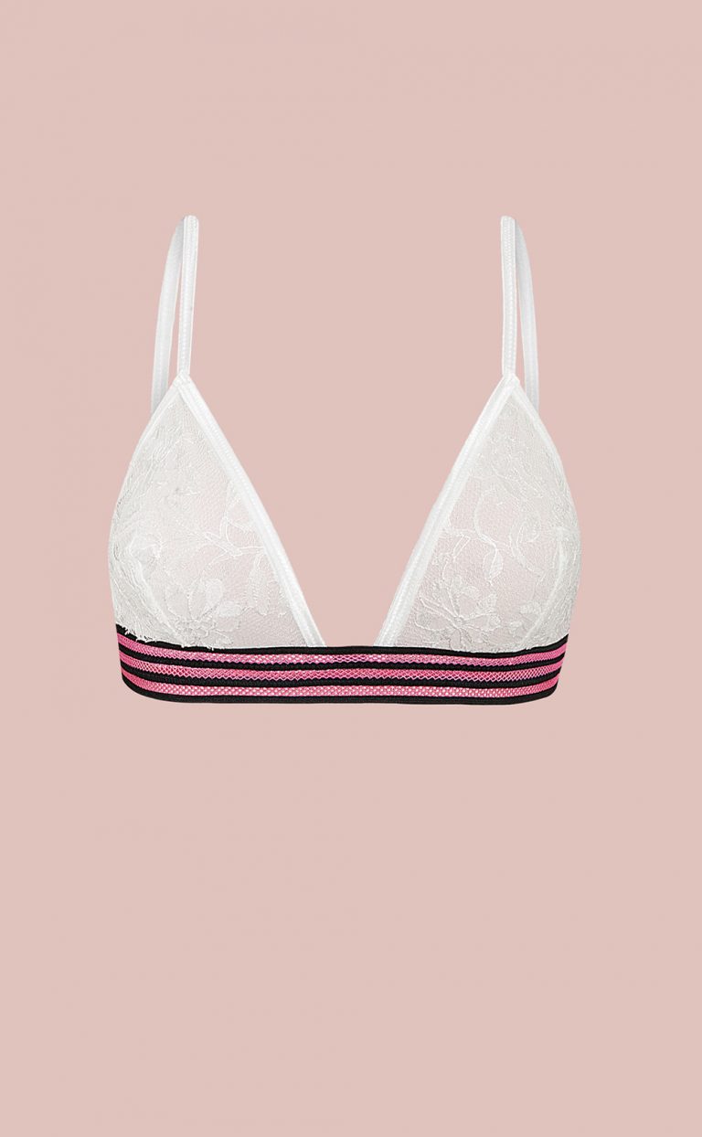 Sportlicher Triangle-Bh aus zarter französischer Spitze mit Blütenmuster. Das breite schwarze Gummi mit Neonpink ist ein großartiger Kontrast.