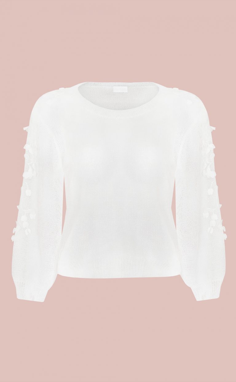 Kuscheliger Pullover mit Mohairwolle und einer Blumenstickerei in 3-D-Effekt auf den halblangen Ärmeln. Perfekt für eine Winterhochzeit, den kühler werdenden Abend an einer Sommerhochzeit und auch später ein vielseitig einsetzbares Lieblingsstück, an dem Du noch viel Freude haben wirst.