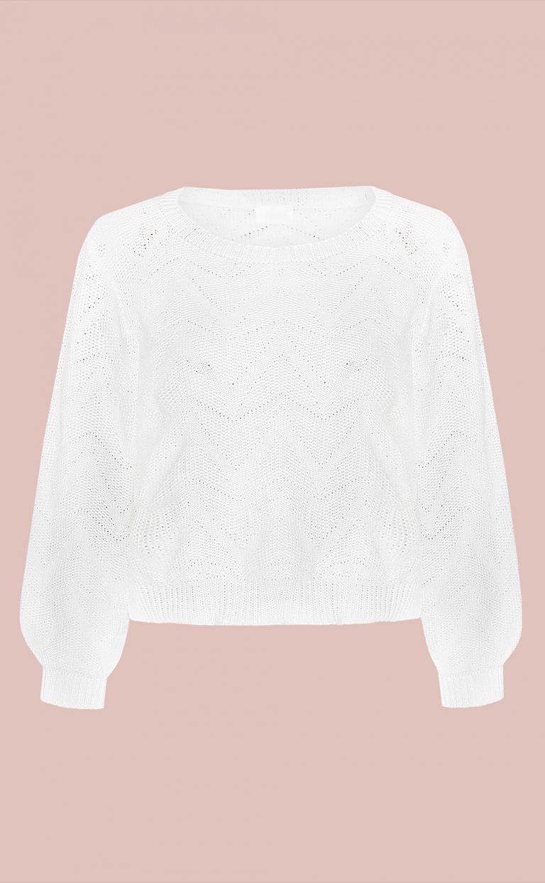 Veganer Pullover mit halblangen Ärmeln und einem modernen Zick-Zack-Muster. Ein toller Brautpullover für deine standsamtliche Hochzeit, dass sich auch nach deiner Feier super im Alltag tragen läßt.