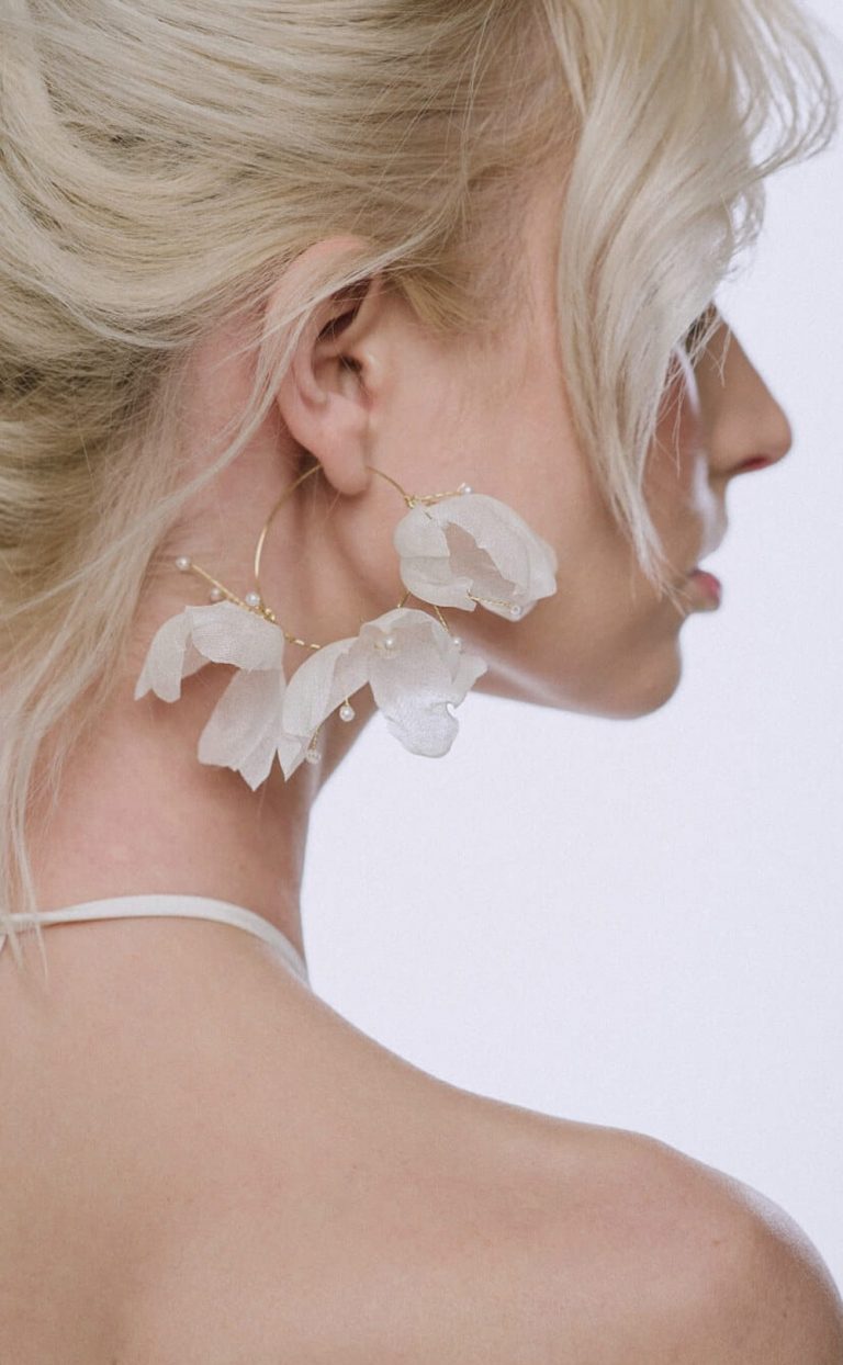 Die Sheer Orchid Hoops Ohrringe sind zarte hängende Creolen aus handgefertigten Seidenblüten. Drei wunderschöne ivoryfarbenen Blüten sind mit Perlen um die Creole drapiert.