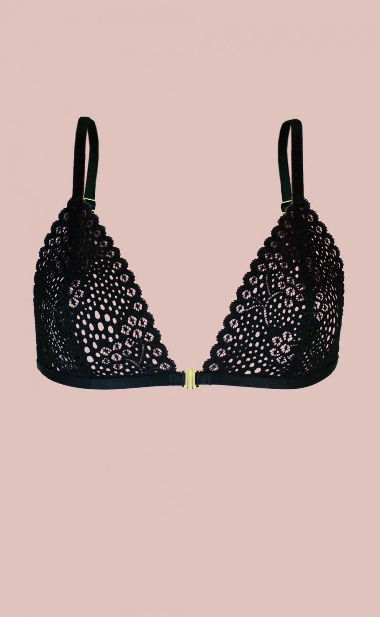 Schwarzer Triangle-Bh aus französischer Spitze mit einem hübschen Lochmuster. Der Rücken ist nur durch die zarten Bänder eingerahmt und daher besonders sexy. Ein goldener Verschluß vorn setzt einen besonderen Akzent im Dekolleté. In Kombination getragen mit dem Sweet Black Pantie oder Sweet Black Slip hast Du nicht nur die perfekte Lingerie für deinen Alltag, sondern auch für besondere Überraschungen.
