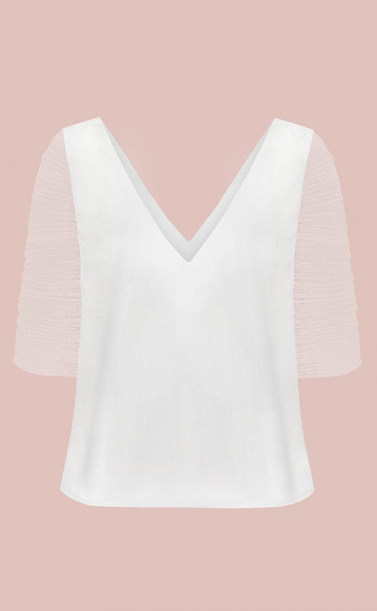Elegantes Top aus Seide mit einem V-Ausschnitt. Besonderheit sind die halblangen Ärmel aus einem plissierten Tüll.