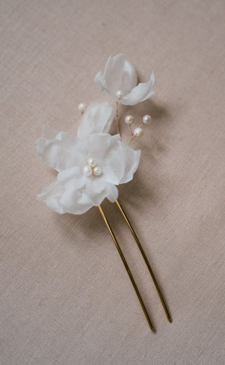 Undine ist ein Haaraccessoire aus feinen Seidenblüten und Süßwasserperlen. Die größere Blüte ist an einer goldenen Haarnadel befestigt, sodass das Schmuckstück einfach zu handhaben ist. Die kleinere Blüte und die einzelnen Perlen sind mit vergoldetem Draht an der Haarnadel verbunden. Du kannst sie je nach Frisur einfach in die Richtung verbiegen, die Du schön findest.