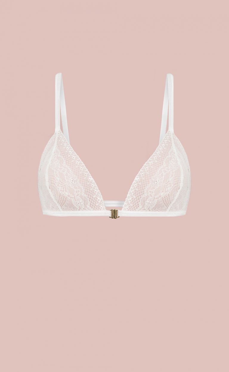 Romantischer Triangle- Bh aus einer zarten französischen Spitzenborte. Die Versteller sind in schönem Roségold gehalten. Eingefaßt mit einem schön glänzenden Gummi.